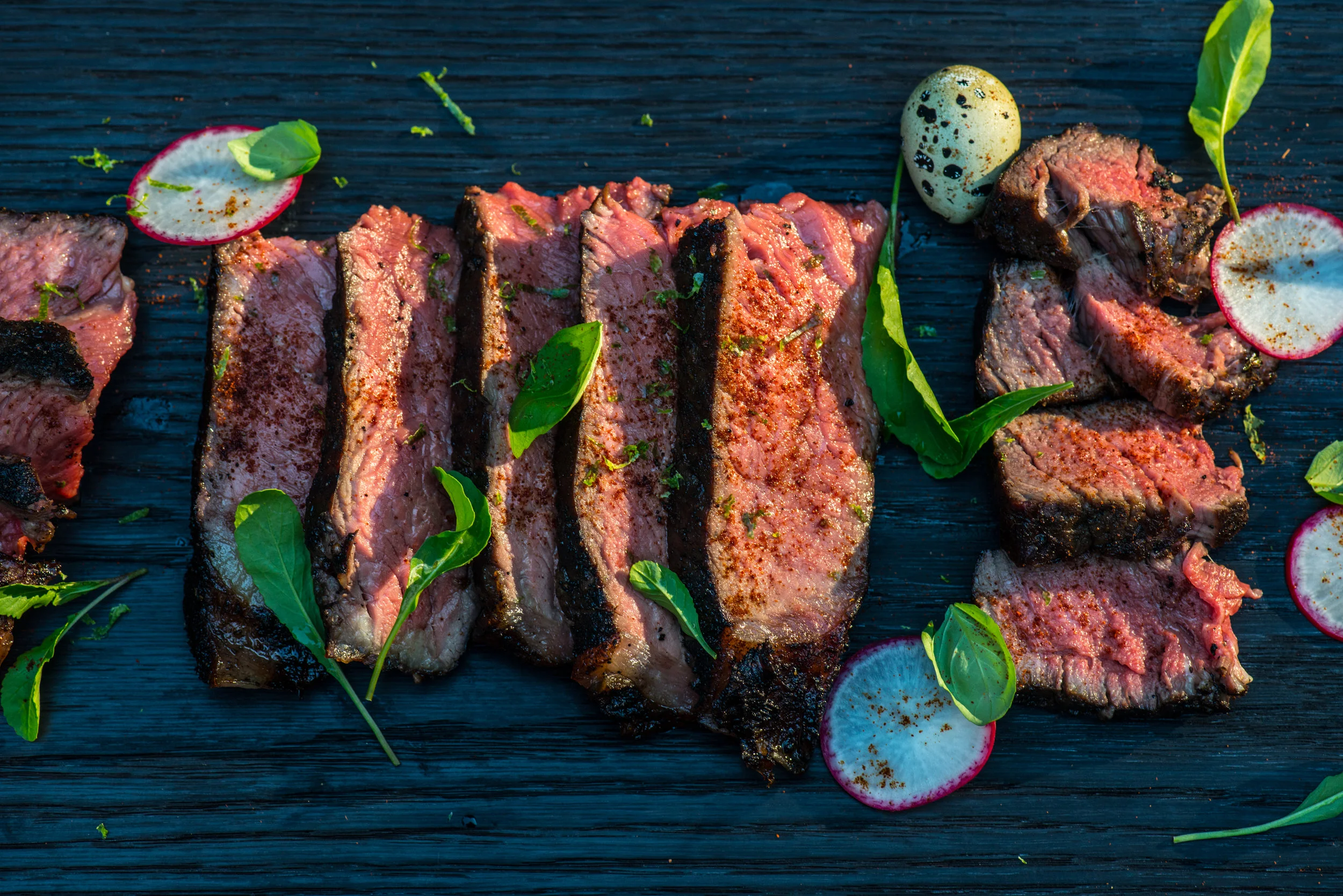 I like to serve family style on one of our large charred boards. The dark surface really lets the colors of the meat shine. This time I've take radishes, arugula and baby basil from our garden, with some smoked quail eggs, and a few tomatoes, dusted with spices and cheese and torched until crispy. Last but not least, a little more paprika and a little lime zest from a micro plane, and it's ready to disappear.