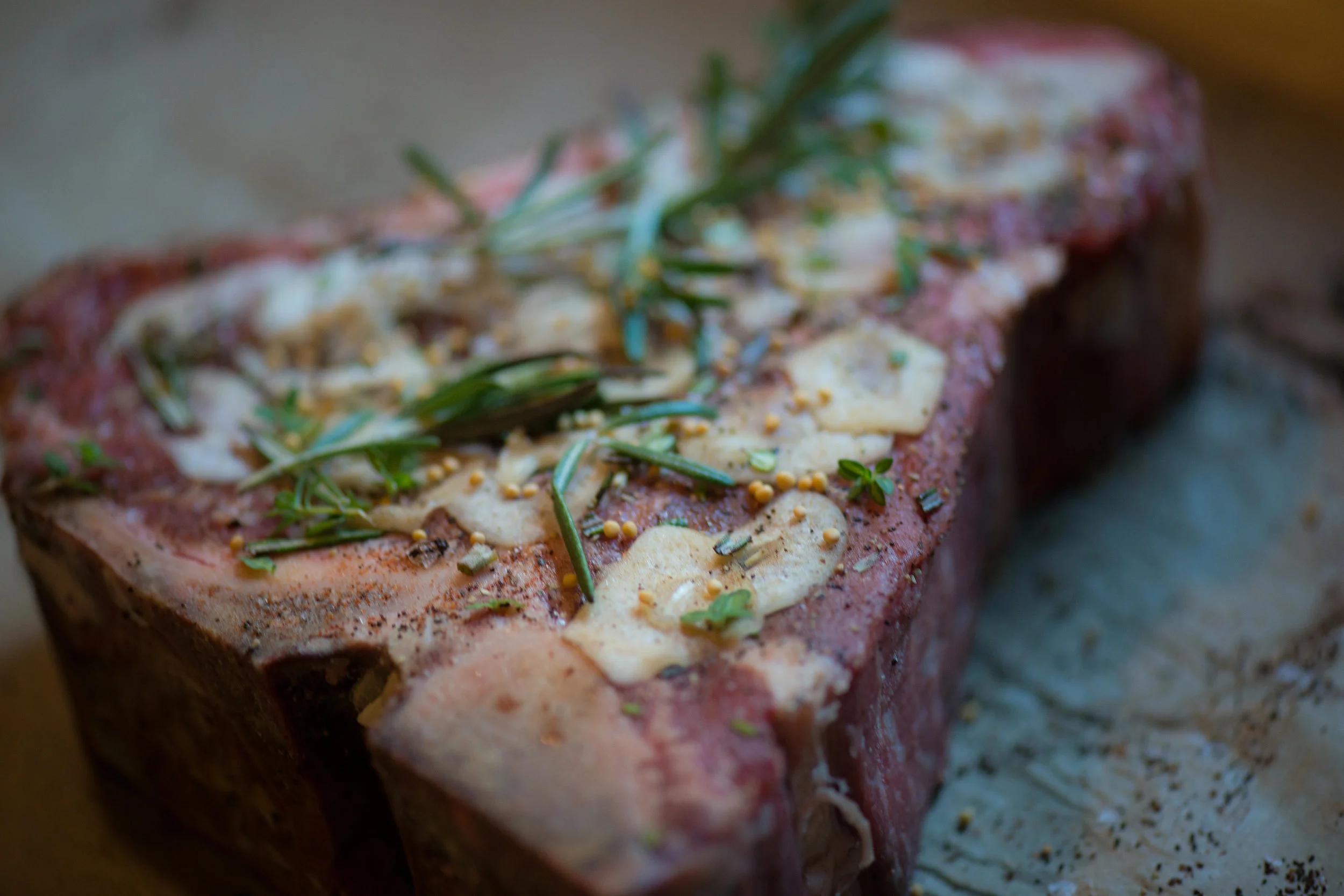 Start by laying out a large sheet of parchment paper. It needs to be large enough to wrap tightly around the whole steak. I also do all my seasoning on the paper so I dont loose anything that doesn't stick to the surface. Shave your garlic paper thin, salt and pepper both sides of the steak well (probably 1 teaspoon of coarse sea salt per side, and enough pepper to match). Then I start covering the steak in the garlic. Once there's a nice even coating of garlic I dust both sides with paprika, espresso (especially the fat) and mustard seed, then break the leaves off of the rosemarry and thyme and pepper each side with those. I usually throw a few whole stalks of herbs in the wrapping right at the end too.