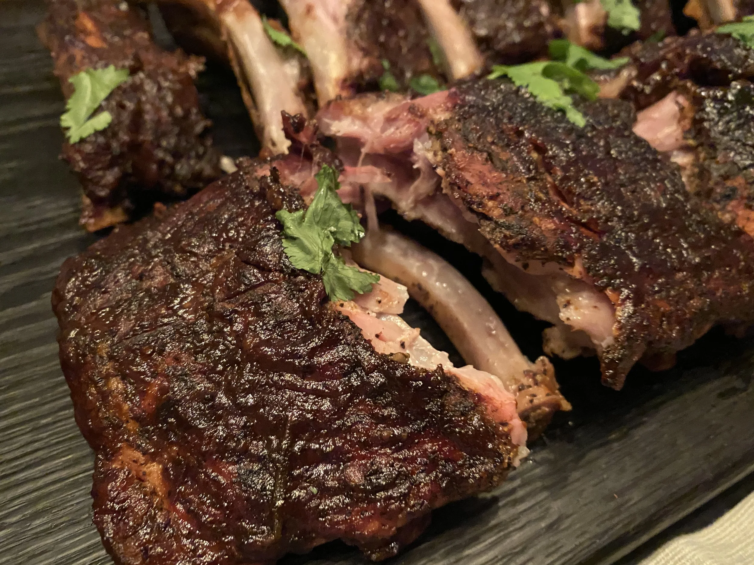 You want to make sure you remove small flaps or tiny bits of fat from the top. It should be even, clean and smooth. I also like to lightly score the top diagonally against the grain. On the bottom side use a paper tower to grab the thing membrane that covers the bones and peel it off. Leave the casing around the bone so they stay connected while they cook… if you completely expose the bones you’ve gone too far. I like to cut a thin edge on the most exposed side and slowly work it up. If you can get enough to grab you can usually peel it off in one pull.